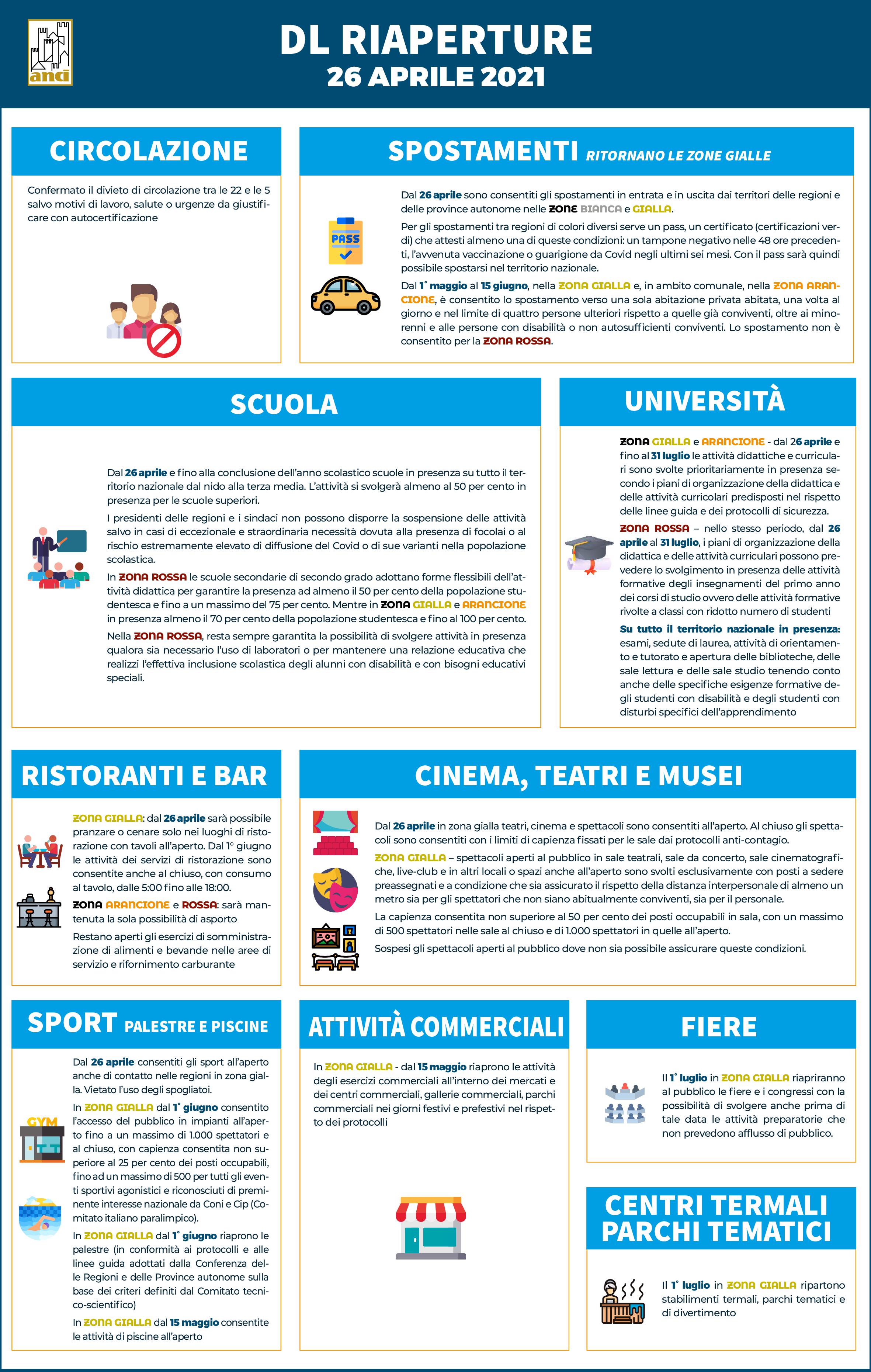 Il Consiglio dei ministri ha approvato un nuovo decreto legge che fissa il calendario delle riaperture a partire dal 26 aprile che sarà in vigore fino al 31 luglio. L’Anci ha predisposto un’...