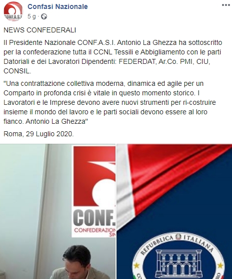 NEWS CONFEDERALI Il Presidente Nazionale CONF.A.S.I. Antonio La Ghezza ha sottoscritto per la confederazione tutta il CCNL Tessili e Abbigliamento con le parti Datoriali e dei Lavoratori Dipendenti:...