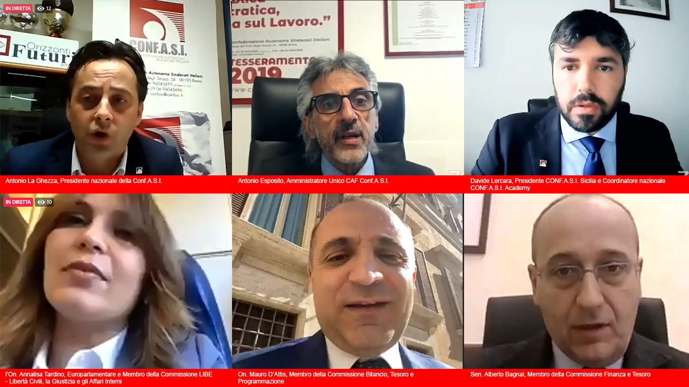 Si consiglia di provare ad accedere al corso almeno 30 minuti prima dell'inizio. __________________________________________________________________________________________________________ Programma dell’evento: Ore 09:00 - Saluti Antonio La Ghezza Presidente nazionale della CONF.A.S.I. SALUTI ISTITUZIONALI. Ore 09:30 On.Annalisa Tardino Europarlamentare – Membro della Commissione LIBE - Libertà Civili, la Giustizia e gli Affari Interni Per conoscere il profilo dell'On.Annalisa Tardino Clicca qui Ore 09:45 Sen.Alberto Bagnai Senatore della Repubblica Italiana – Membro della Commissione Finanza e Tesoro Per conoscere il profilo del Sen.Alberto Bagnai Clicca qui Ore 10:00 On.Mauro D'Attis Deputato delle Repubblica Italiana - Membro della Commissione Bilancio, Tesoro e Programmazione Per conoscere il profilo dell'On.Mauro D'Attis Clicca qui Ore 10:15 Approfondimenti sulle ispezioni effettuate presso le Sedi Periferiche dall'Agenzia delle Entrate. Antonio Esposito Amministratore Unico CAF CONF.A.S.I. S.r.l. Ore 10:30 Le novita' del Modello 730/2021 redditi 2020 Dr.Pino Sulcanese Responsabile Assistenza Fiscale del CAF CONF.A.S.I. S.r.l. Ore 12:00 La Firma Elettronica Avanzata Dr.Vincenzo Angiolino Direttore Generale Sesamo Software SpA Ore 12:40 Approfondimenti tecnici relativi alla piattaforma Sesamo Software online. Dr.Aldo Radano Responsabile Tecnico e Controlli del C.A.F. CONF.A.S.I. Srl Tiziana Girau Coordinatrice della Formazione del C.A.F. CONF.A.S.I. Srl Ore 14:00 Termine dei lavori.